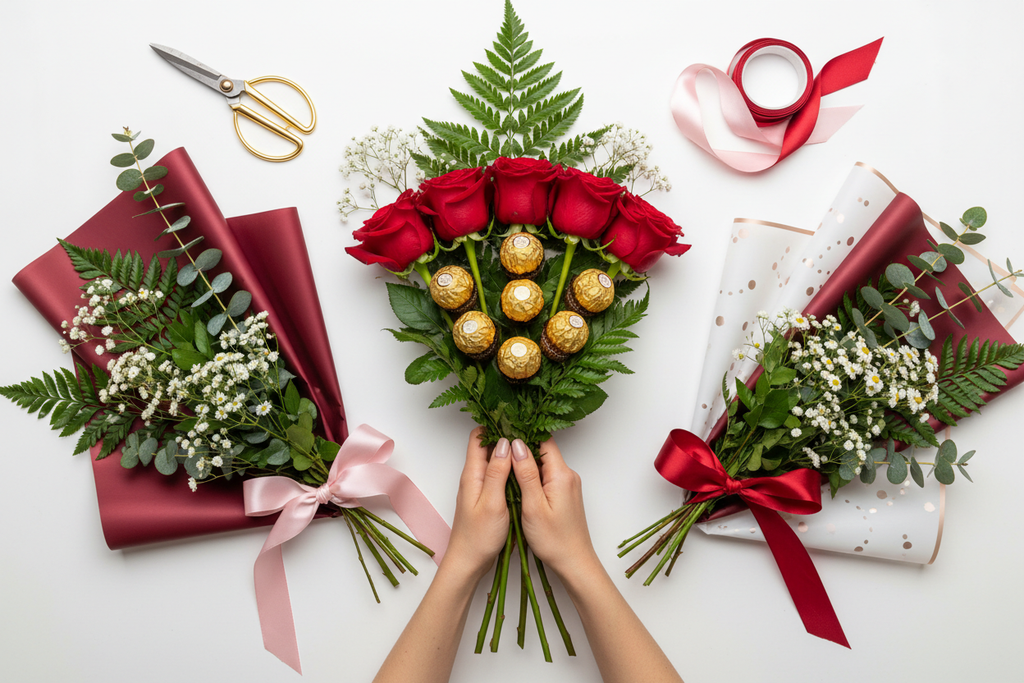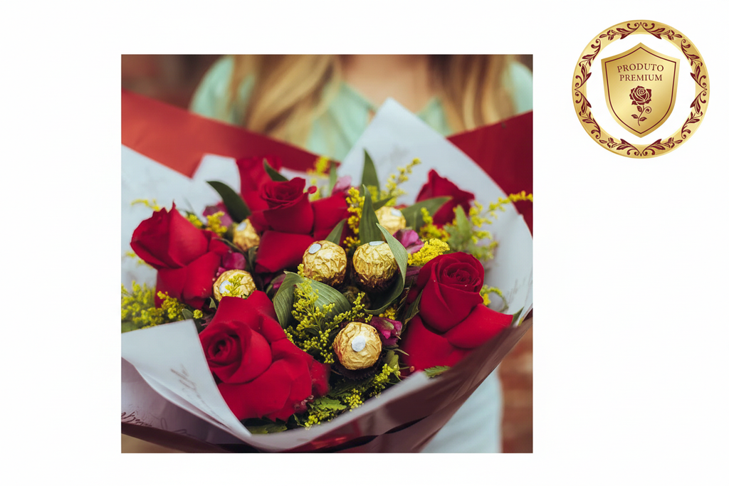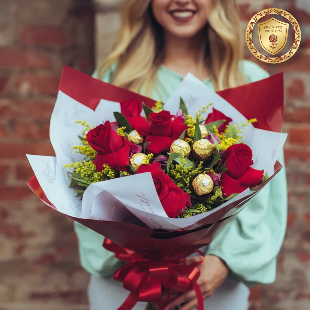 O buquê possui Meia dúzia de rosas vermelhas e uma dúzia de bombons ferrero rocher envoltas em embalagem kraft especial !