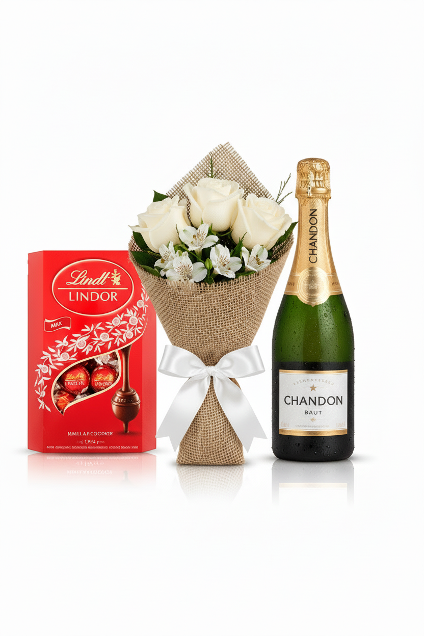 Nós ajudamos você a escolher o melhor presente! Este combo premium de Ano Novo é confeccionado com 3 rosas brancas frescas, astromélias brancas, espumante Chandon Baby (187ml) e bombons Lindt Lindor, perfeito para celebrar momentos especiais e brindar o Ano Novo com elegância e sofisticação.