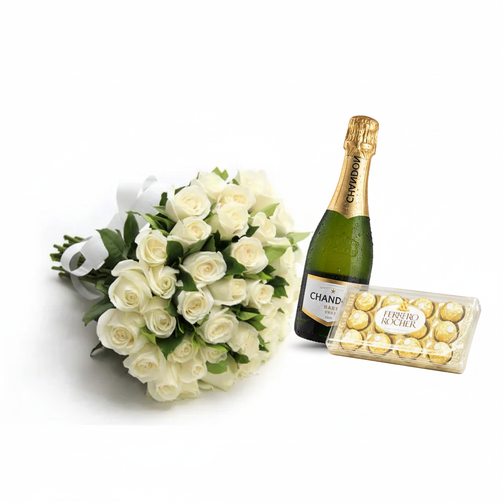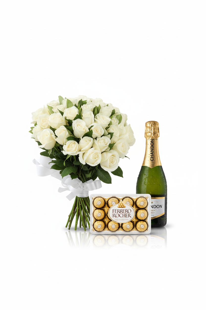 🎊 Combo Ano Novo Premium - Rosas Brancas + Ferrero + Chandon - Celebre com Elegância