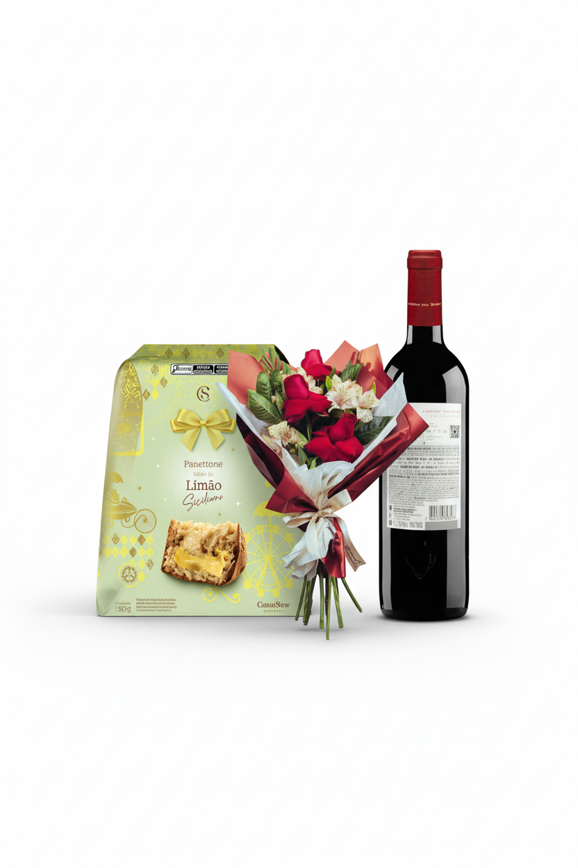 🍋🍷🌹 Combo Natal Premium - Panetone Limão + Vinho + Buquê 3 Rosas - Presente Completo e Sofisticado